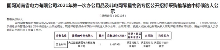 恭喜我司中標湖南電力有限公司21年第一次零星物資采購