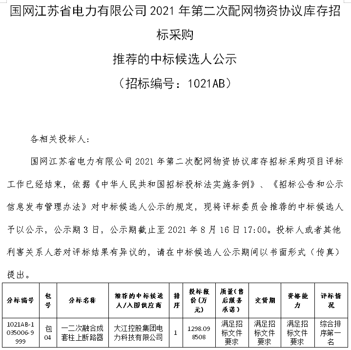 恭喜我司中標國網江蘇省電力有限公司21年第二次配網物資協議庫存招標采購