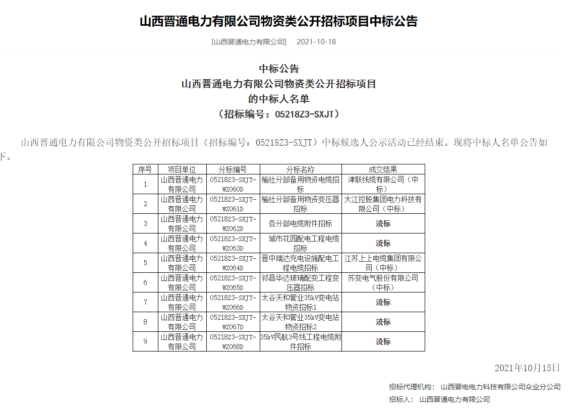 恭喜我司中標山西晉通電力有限公司物資類公開招標項目