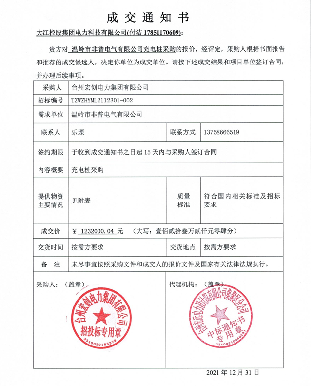 恭喜我司中標溫嶺市非普電氣有限公司充電樁采購