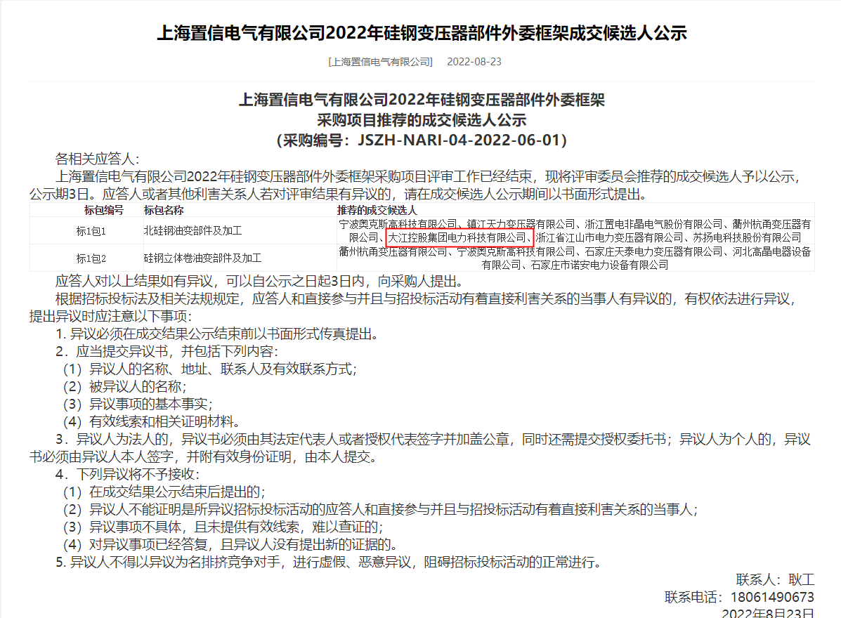 恭喜我司中標《上海置信電氣有限公司2022年矽鋼變壓器部件外委框架采購項目》