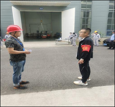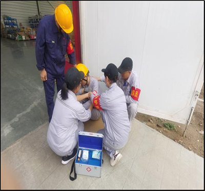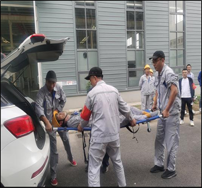 演練開始,倉(cang) 儲(chu) 部員工趙德超在庫區內(nei) 使用5T起重機吊裝銅牌正在作業(ye) ,員工魏亞(ya) 方駕駛叉車進行物資運輸作業(ye) ,因吊運銅牌距離地麵約1.5米,在魏亞(ya) 方駕駛叉車經過時,銅牌旋轉導致插入叉車駕駛艙,將魏亞(ya) 方手臂擊中劃傷(shang) 導致大出血癱坐在駕駛椅上。趙德超發現魏亞(ya) 方受傷(shang) 後立即鳴哨代表事故發生,跑步到副總指揮孟雪峰麵前簡單報告特種設備傷(shang) 害事故地點、機械、人員具體(ti) 情況。隨即孟雪峰向總指揮劉冬冬報告,劉冬冬指示“盡快搶救傷(shang) 員,立即啟動特種設備傷(shang) 害突發事故應急預案”。副總指揮孟雪峰立即與(yu) 當地醫院進行協調請求醫療支援,並安排後勤保障組組長周仕磊保證演練救護便道的暢通及救護車輛的引導;安全警戒組組長王習(xi) 風率領安全警戒組成員王波波迅速拉起警戒線,引導周圍職工撤離到安全區並疏散圍觀人員,為(wei) 現場救護提供了足夠的場地。應急救援組組長陳鵬輝率領應急救援組成員莊富強、趙森、陳讚跑到事故叉車旁將受傷(shang) 員工魏亞(ya) 方從(cong) 駕駛艙內(nei) 轉移到地麵準備接受現場應急醫療救援;醫療救護組組長高傑率領醫療救護組成員李秀榮、淩蕾攜帶急救箱和擔架到達事故地點,對受傷(shang) 人員魏亞(ya) 方進行進行消毒、止血、包紮等簡單處理,並初步查看其受傷(shang) 程度,以便進行下一步的救護工組;醫院急救車120在後勤保障組組長周仕磊的引導下來到事故演練現場;醫療救護組組長高傑立即安排2位員工(徐鬆、薛龍峰)將傷(shang) 員用擔架抬至醫院救護車上,醫療救護組李秀榮、淩蕾隨車出發護理傷(shang) 員;安全警戒組組長王習(xi) 風率領安全警戒組成員王波波收起警戒帶並對現場進行善後處理。
