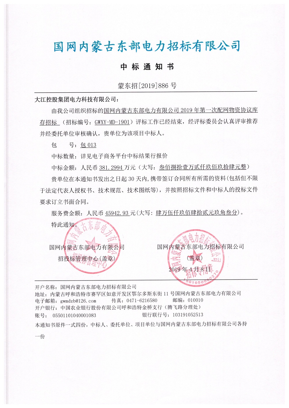 恭喜我司中標國網內蒙古東部電力有限公司2019年第一次配網物資協議庫存