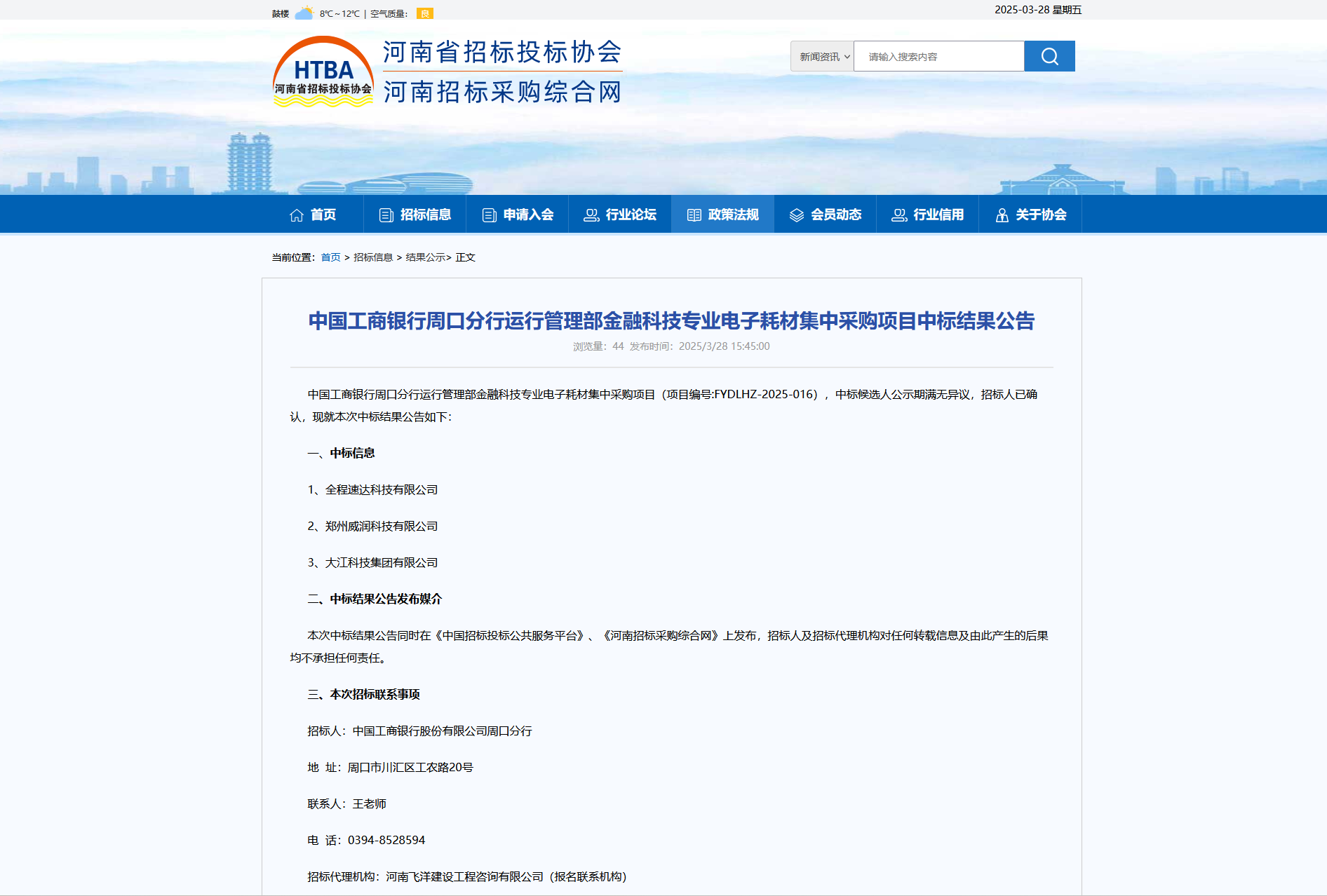 [喜報]熱烈祝賀我司成功中標中國工商銀行周口分行專業電子耗材集中采購項目