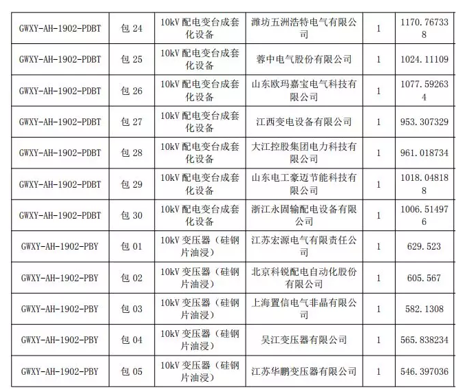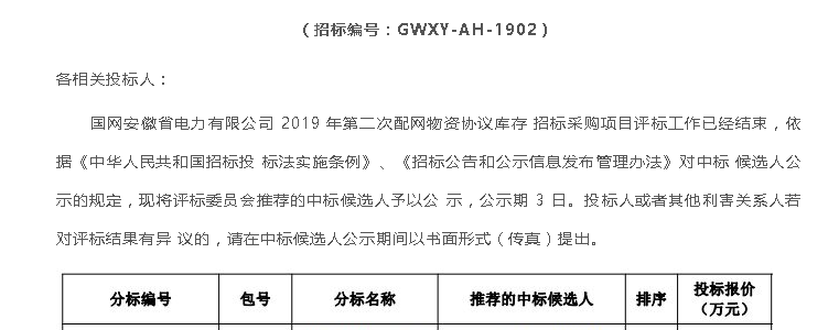 恭喜我司中標國網安徽省電力有限公司 2019 年第二次配網物資協議庫存